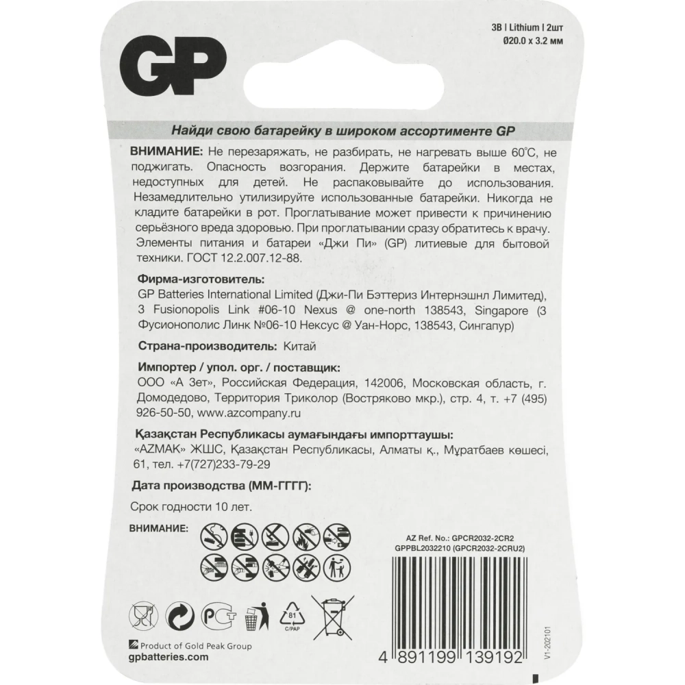 Батарейка GP CR2032, 3V, литий, бл/2шт, CR2032-2CRU2