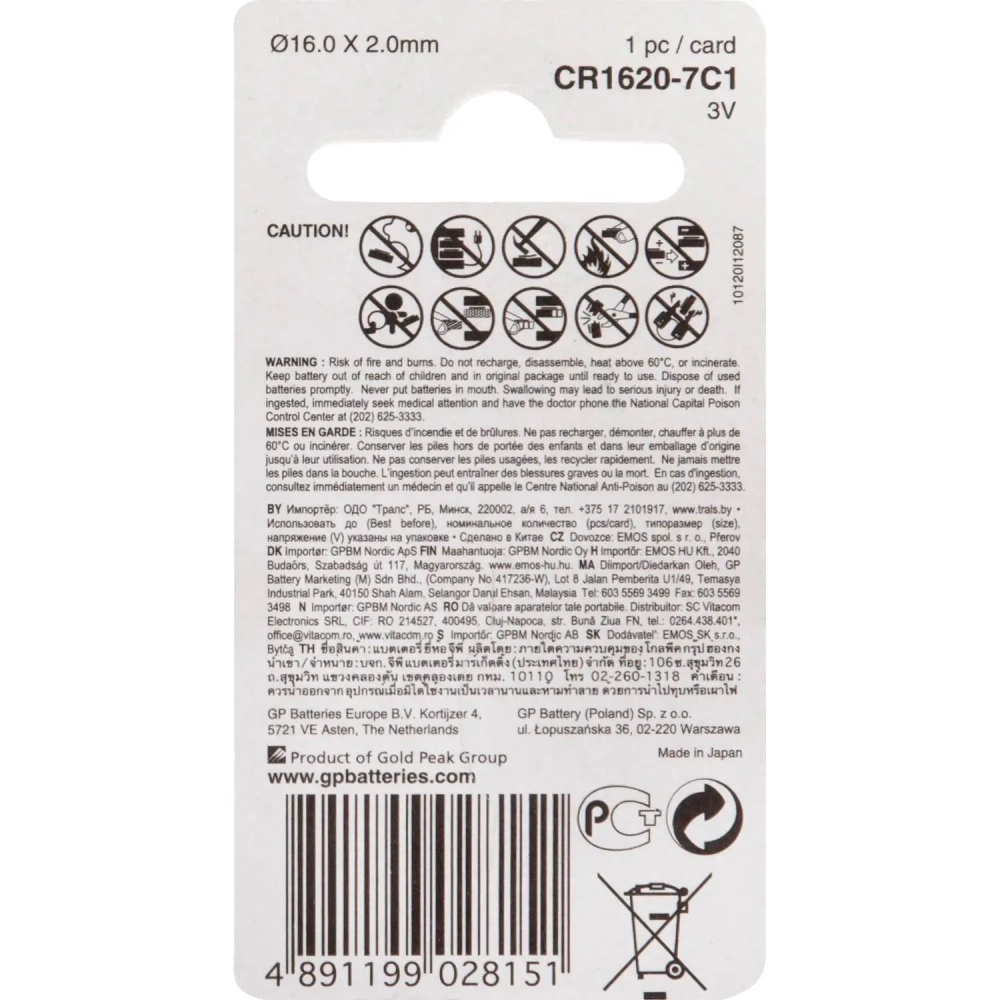 Батарейка GP Lithium CR1620 бл/1шт, CR1620-7C1