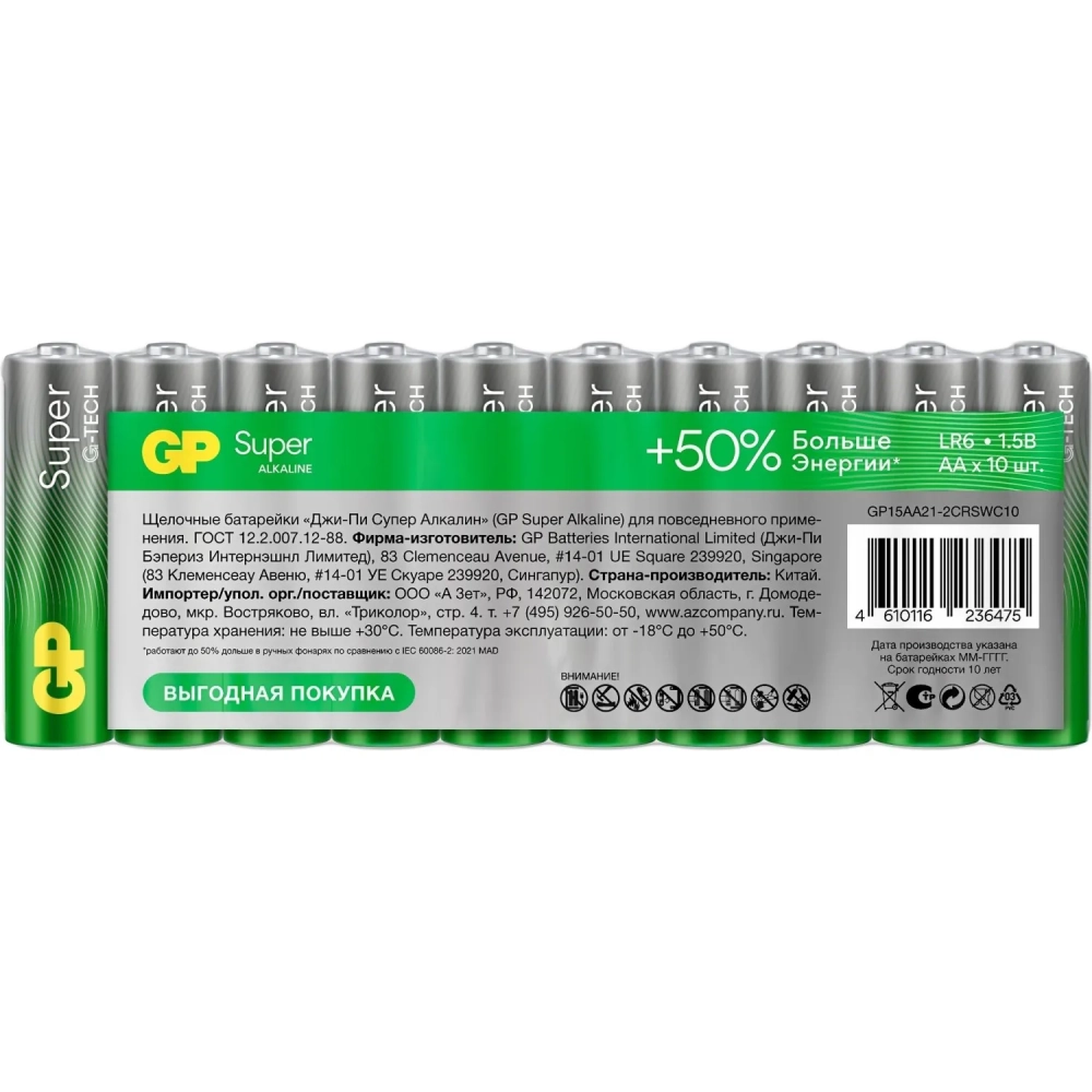 Батарейка GP Super AA/LR6/15A 15A-2CRB10/15AA21-2CRSWC10 алкалин.,10 шт/уп