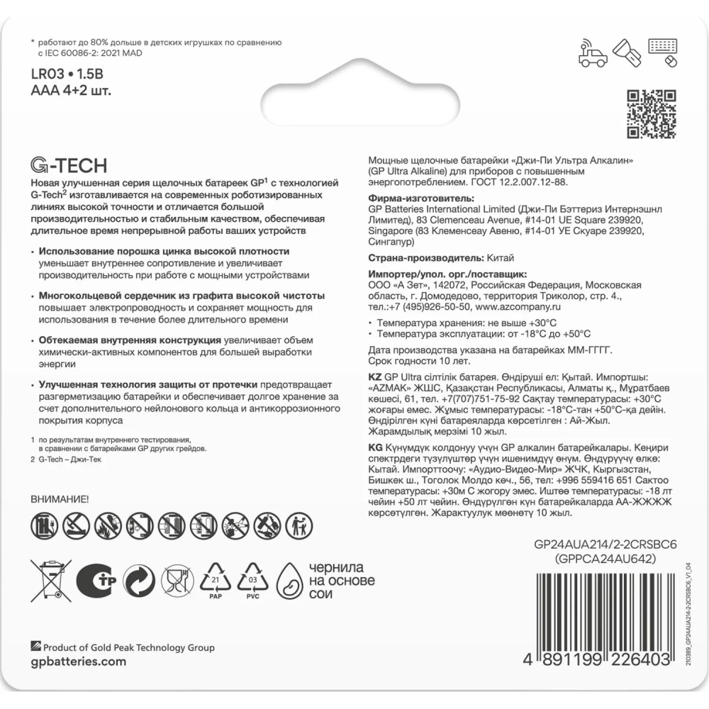 Батарейка GP Ultra AAА, бл/6шт 24AU4/2-2CR6 / 15AUA214/2-2CRSBC6