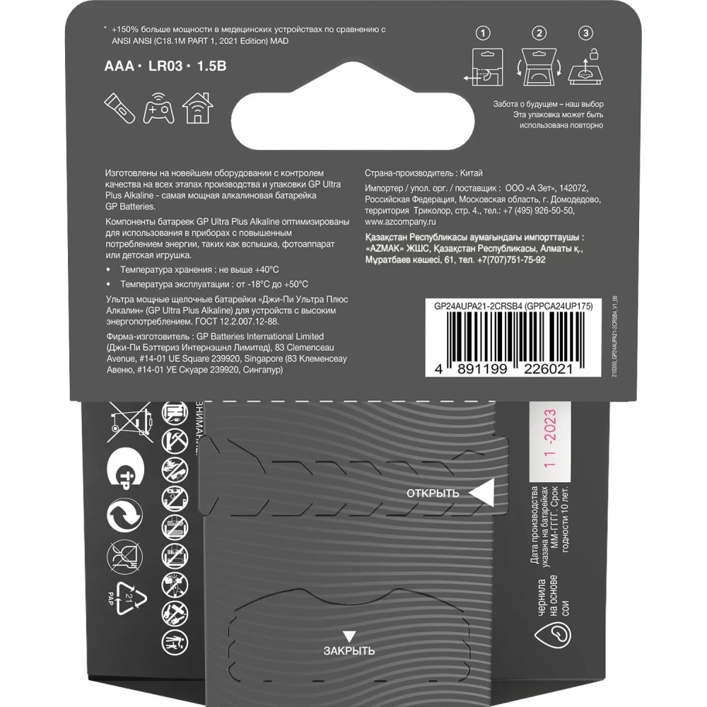 Батарейка GP Ultra+ Alkaline LR03 (AAA) 4шт/уп (24AUPA21-2CRSB4)