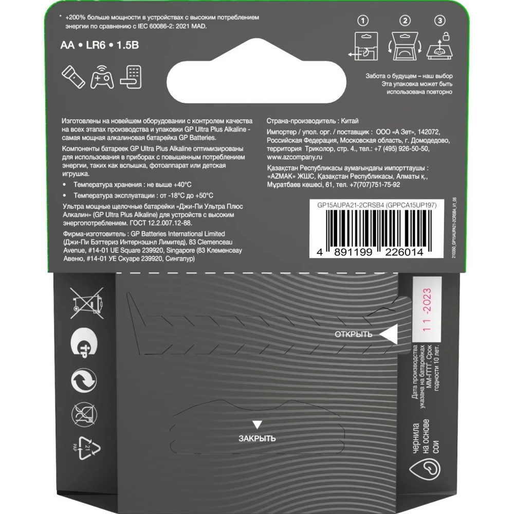 Батарейка GP Ultra+ Alkaline LR6 (АА), 4шт/уп (15AUPA21-2CRSB4)