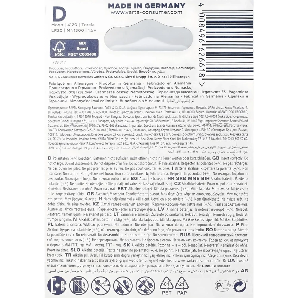 Батарейка Varta ENERGY LR20 D 2шт/бл Alkaline 1.5V (4120) (4120229412)