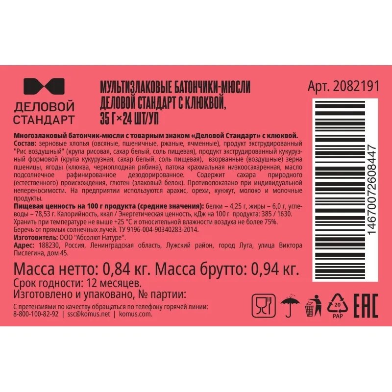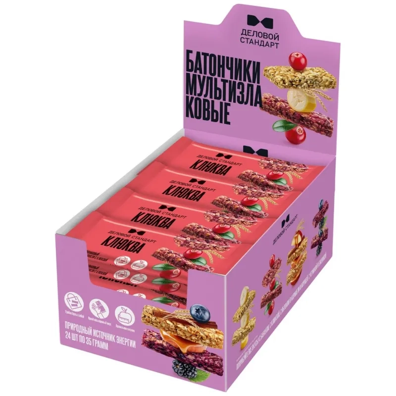 Батончик мюсли мультизлаковый Деловой Стандарт с лесной клюквой 35г 24шт/уп
