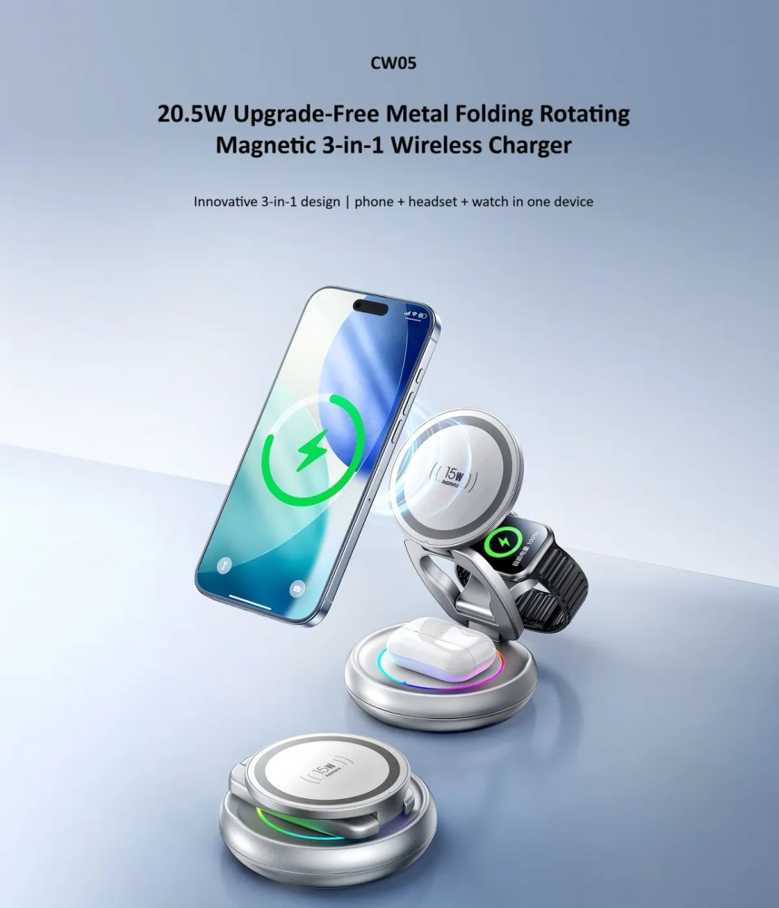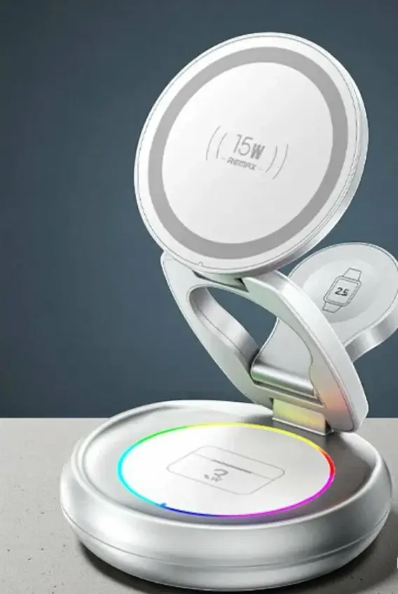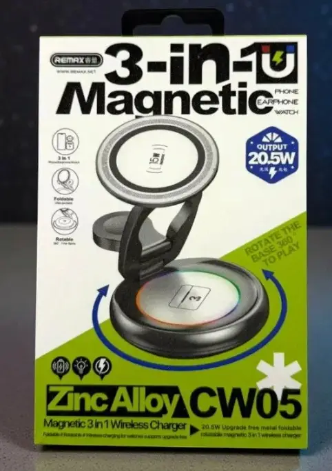 Remax CW05 — многофункциональное магнитное беспроводное зарядное устройство 3-в-1, которое поддерживает одновременную зарядку мобильных телефонов, смарт-часов и наушников.
