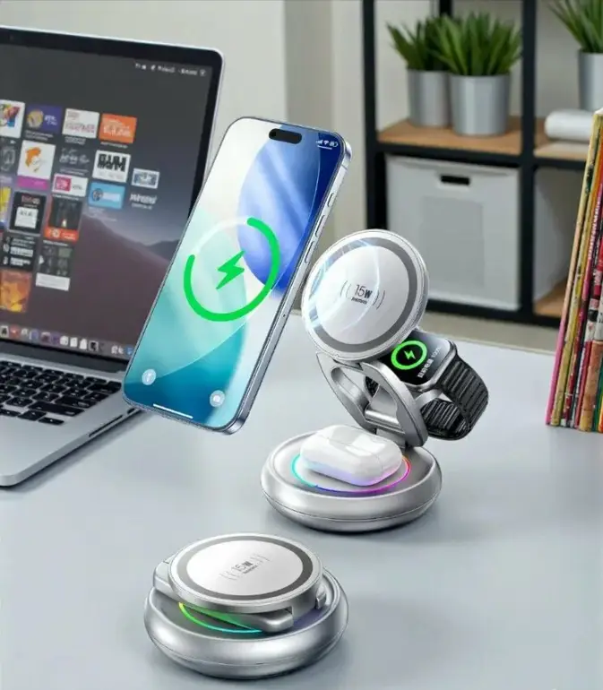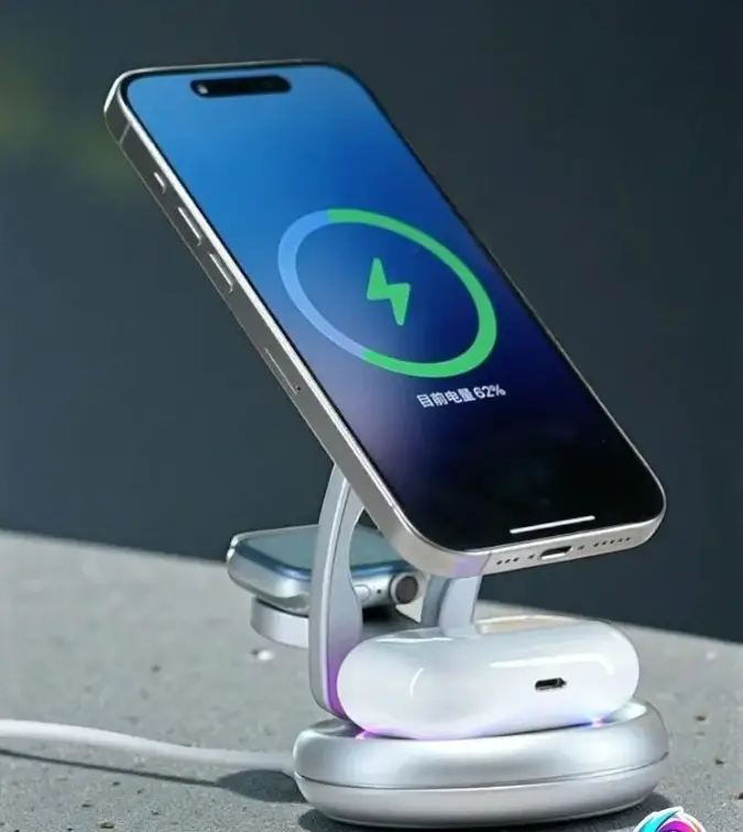 - Универсальное решение для одновременной зарядки телефона, наушников и часов без проводов