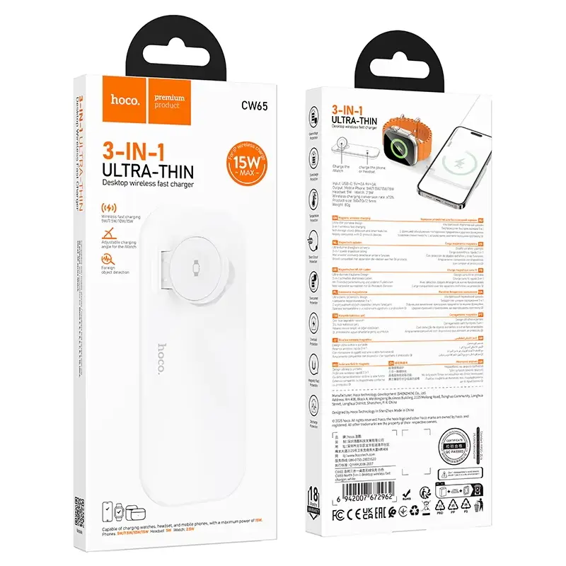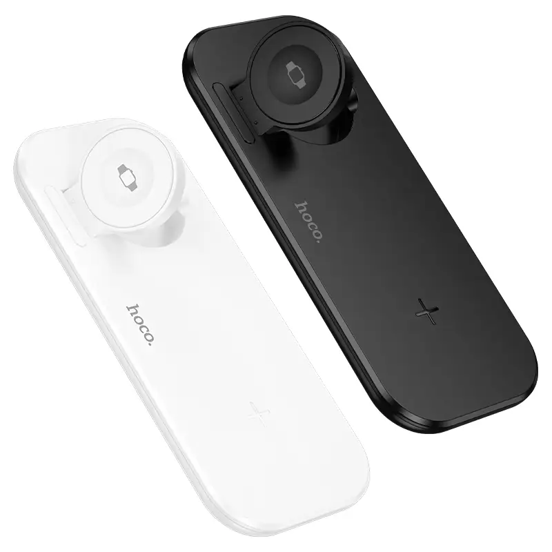 Беспроводное зарядное устройство HOCO CW65 North совместимо со смартфонами и наушниками, поддерживающими технологию Qi. Также оно подходит для часов iWatch 2–10, SE, Ultra/Ultra2.