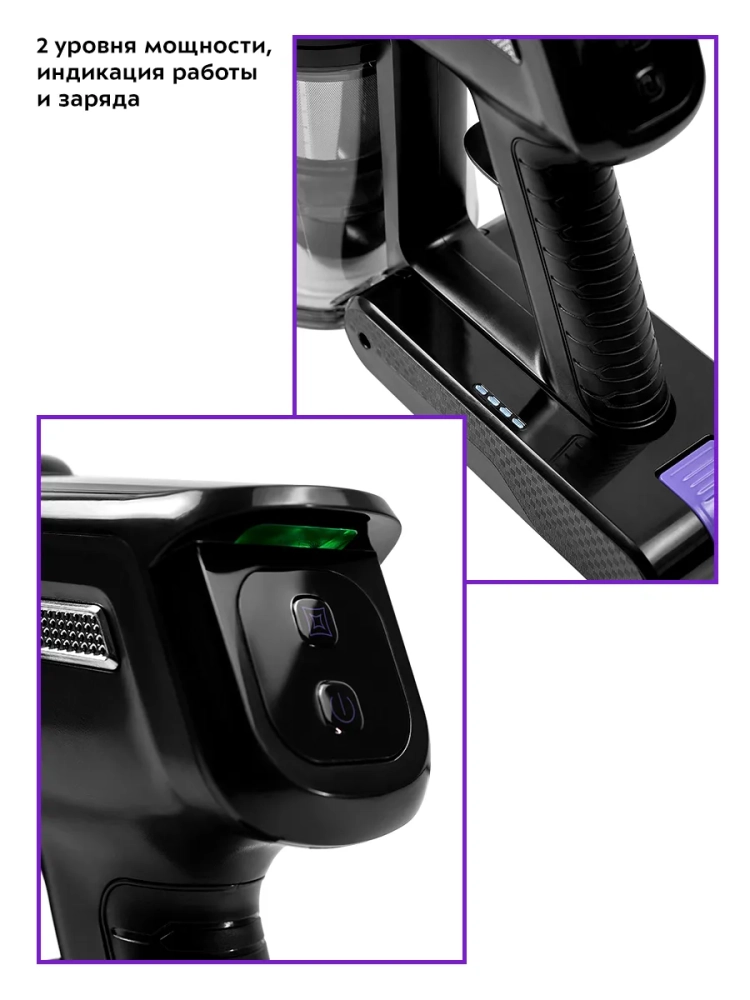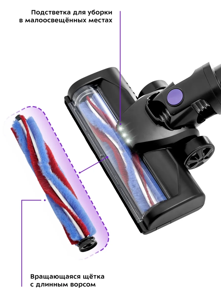 Пылесос комплектуется турбощеткой, которая помогает качественно справиться с очисткой гладких поверхностей и ковровых покрытий с не очень длинным ворсом. Также к пылесосу прилагаются щелевая насадка «2 в 1» и кронштейн для настенного хранения устройства. Светодиодная подсветка напольной щетки сделает уборку комфортной даже в затемненных местах.