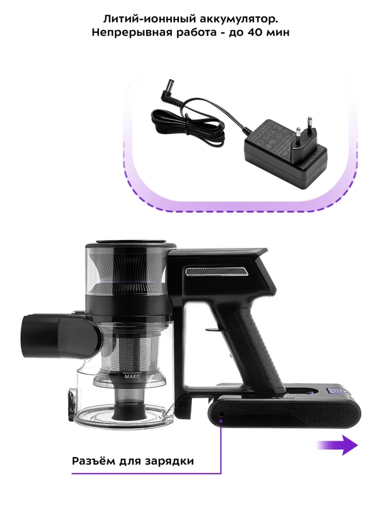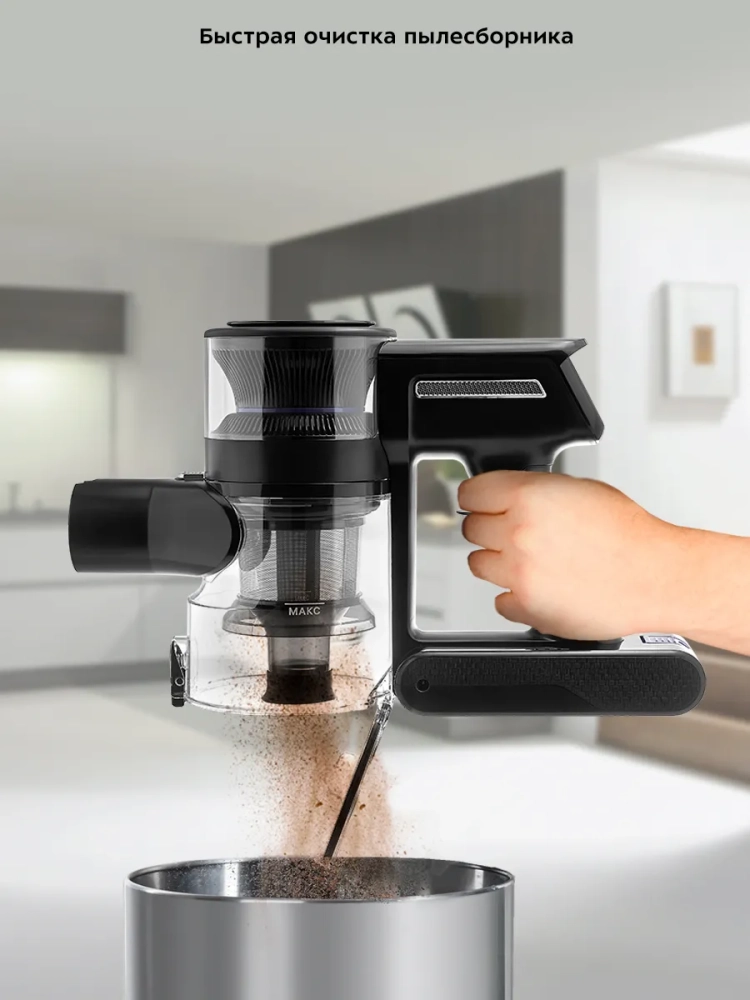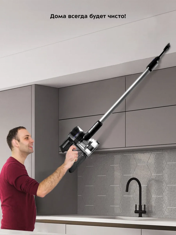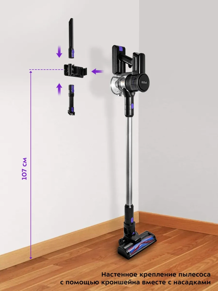 Одно из главных достоинств вертикального пылесоса — его компактность. Во время работы пылесос благодаря своей маневренности может легко убраться в узком коридоре или комнате, заполненной различными предметами. У пылесоса нет функции вертикальной парковки, поэтому пылесос рекомендуется устанавливать на стену с помощью кронштейна и крепежей, идущих в комплекте.