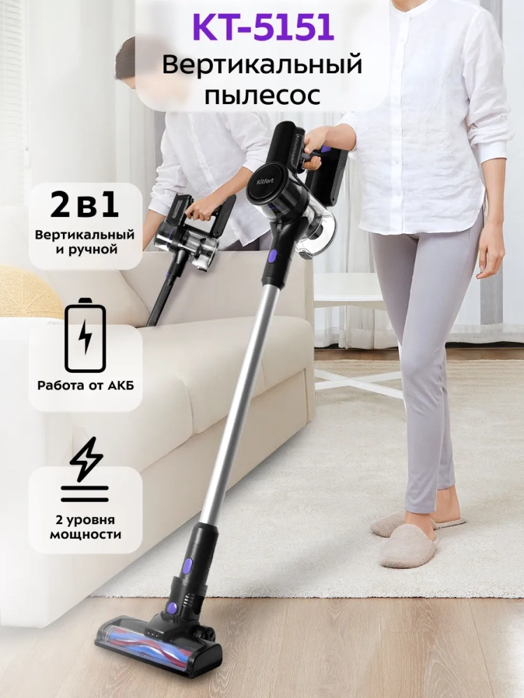 Беспроводной вертикальный пылесос Kitfort КТ-5151 очень удобен при локальной уборке. Он компактен, всегда под рукой и готов к работе. При отсоединении удлинительной трубки и установке насадки он превращается в ручной пылесос. Его конструкция позволяет легко проникать в самые труднодоступные уголки квартиры.