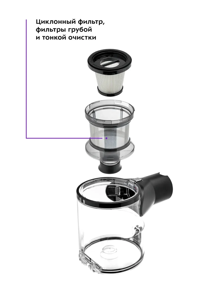 Пылесос оборудован современным циклонным фильтром, обеспечивающим хорошую очистку. Контейнер пылесборника легко снимается, а пыль из него вытряхивается очень просто. В пылесборнике установлены фильтр грубой очистки и фильтр тонкой очистки, которые задерживают частички пыли. Фильтры можно вынуть и промыть водой.