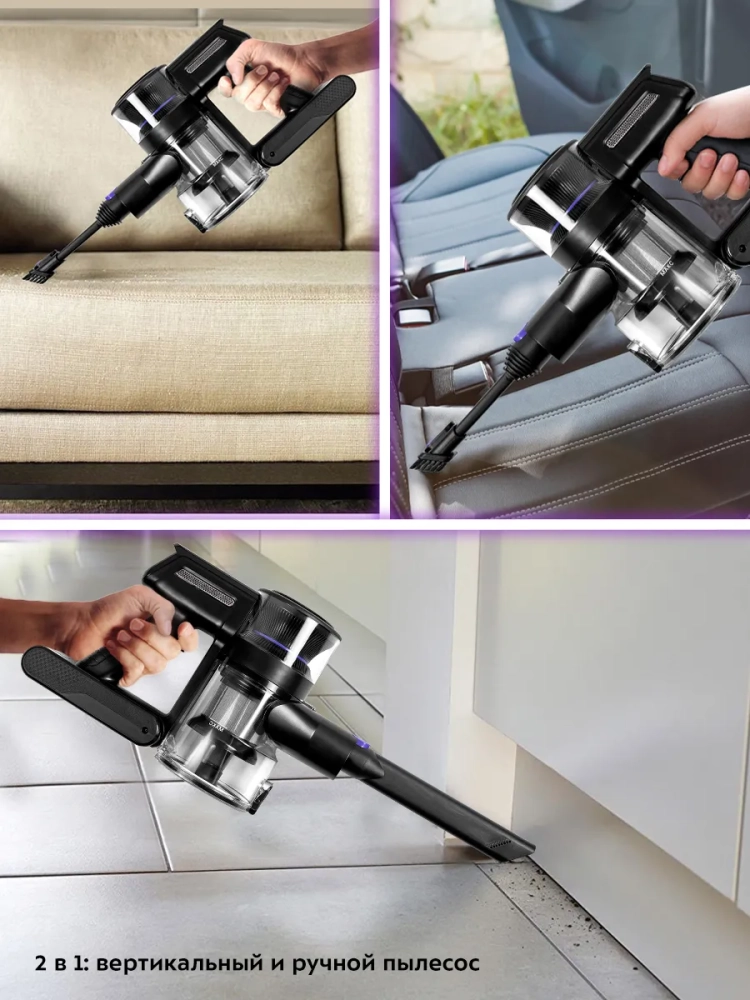 Конструкция «2 в 1» предусматривает наличие ручного пылесоса, который удобно использовать отдельно. Ручным пылесосом можно пропылесосить углы и плинтусы, обивку мебели, пыль со шкафов (куда обычным пылесосом очень трудно дотянуться из-за ограниченной длины шланга), шкафчики на кухне или в гостиной, книжные полки, коврики в автомобиле или багажник.