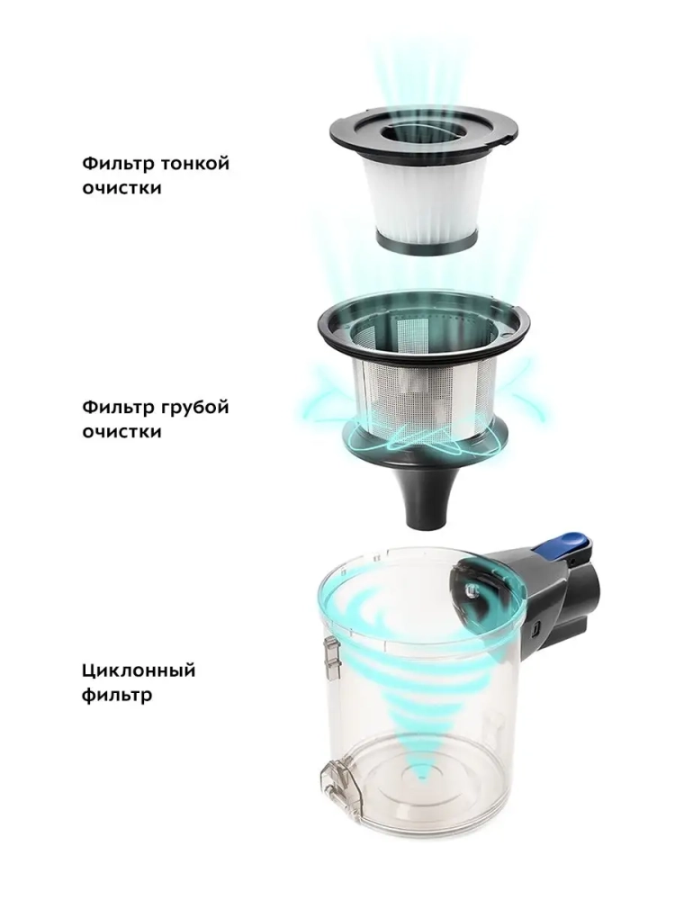 Пылесос оборудован современным циклонным фильтром, обеспечивающим хорошую очистку, при этом сила всасывания почти не зависит от наполненности пылесборника. Контейнер пылесборника легко снимается, а пыль из него вытряхивается очень просто.