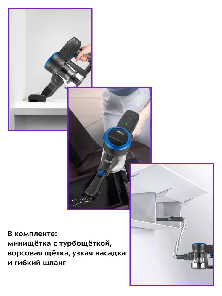 Пылесос комплектуется щеткой для пола с турбощеткой, которая качественно очищает гладкие поверхности и ковровые покрытия с коротким ворсом. Светодиодная подсветка на щетке для пола позволяет увидеть пыль и мусор в плохо освещенных зонах, например, под кроватью или диваном. Также к пылесосу прилагаются ворсовая щетка и узкая насадка, мини-щетка с турбощеткой.
