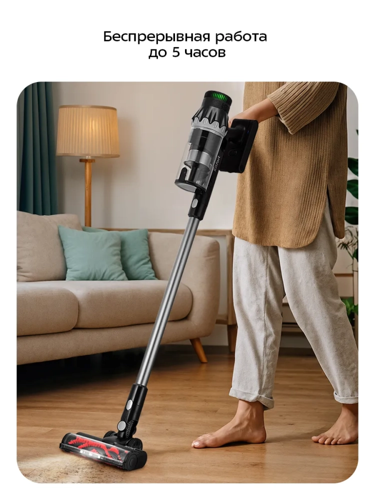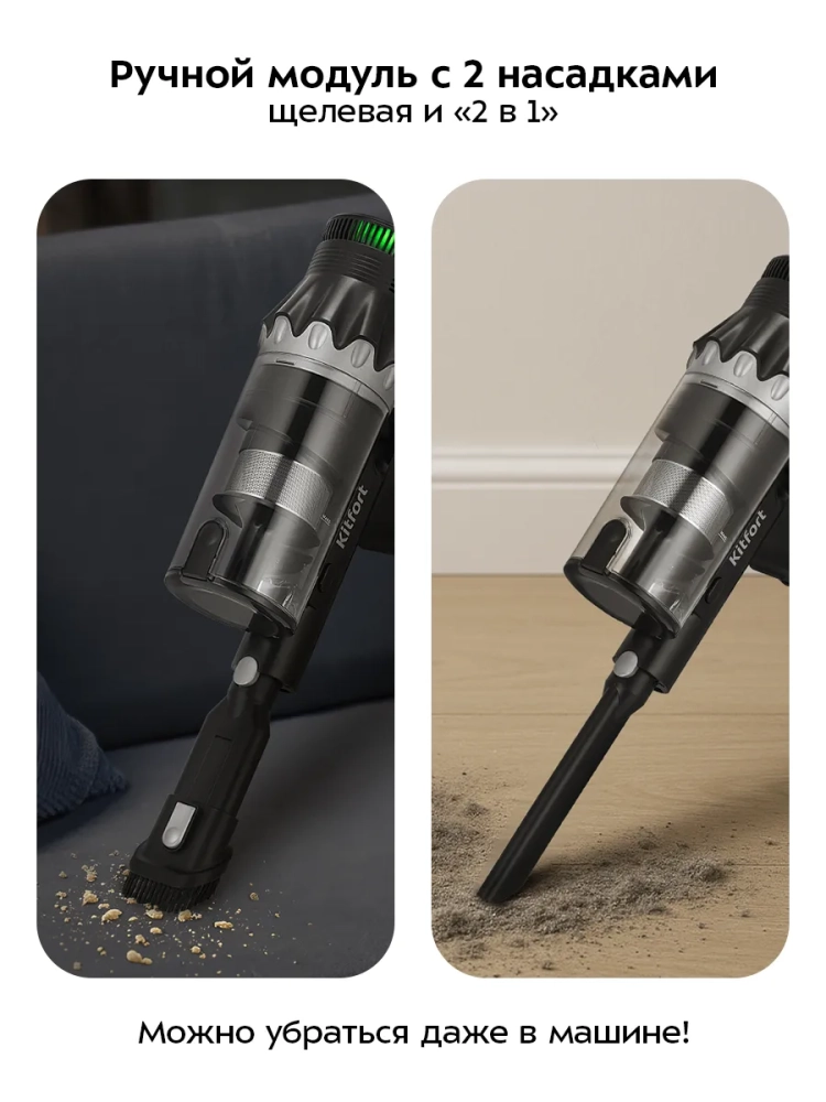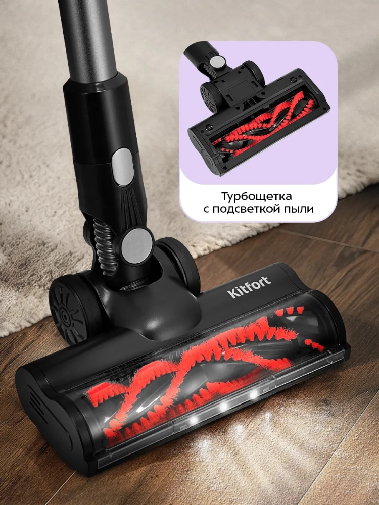 Беспроводной вертикальный пылесос Kitfort КТ-5549 очень удобен при локальной и генеральной уборке. Он компактен, всегда под рукой и готов к работе. При отсоединении удлинительной трубки и установке насадки он превращается в ручной пылесос. Его конструкция позволяет легко проникать в самые труднодоступные уголки квартиры. При этом не нужно передвигать громоздкий корпус проводного пылесоса и управляться с непослушным шлангом. Благодаря работе от аккумулятора не нужно подключать устройство к сети, провода не мешают под ногами. Поэтому пылесос имеет неограниченный радиус действия: от любого уголка квартиры до машины или беседки в саду. Пылесос оснащен маневренной напольной турбощеткой, которая вращается в двух плоскостях. Удлинительная трубка турбощетки позволяет убираться в труднодоступных местах, например под диваном.