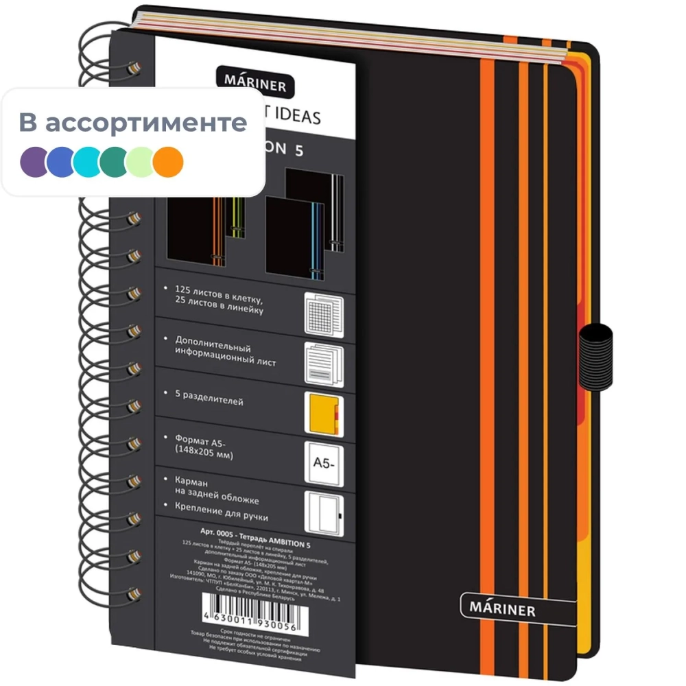 Бизнес-тетрадь Ambition 5,А5,150л,148х205,5 раз,рез под руч,кл+л,красн,0005