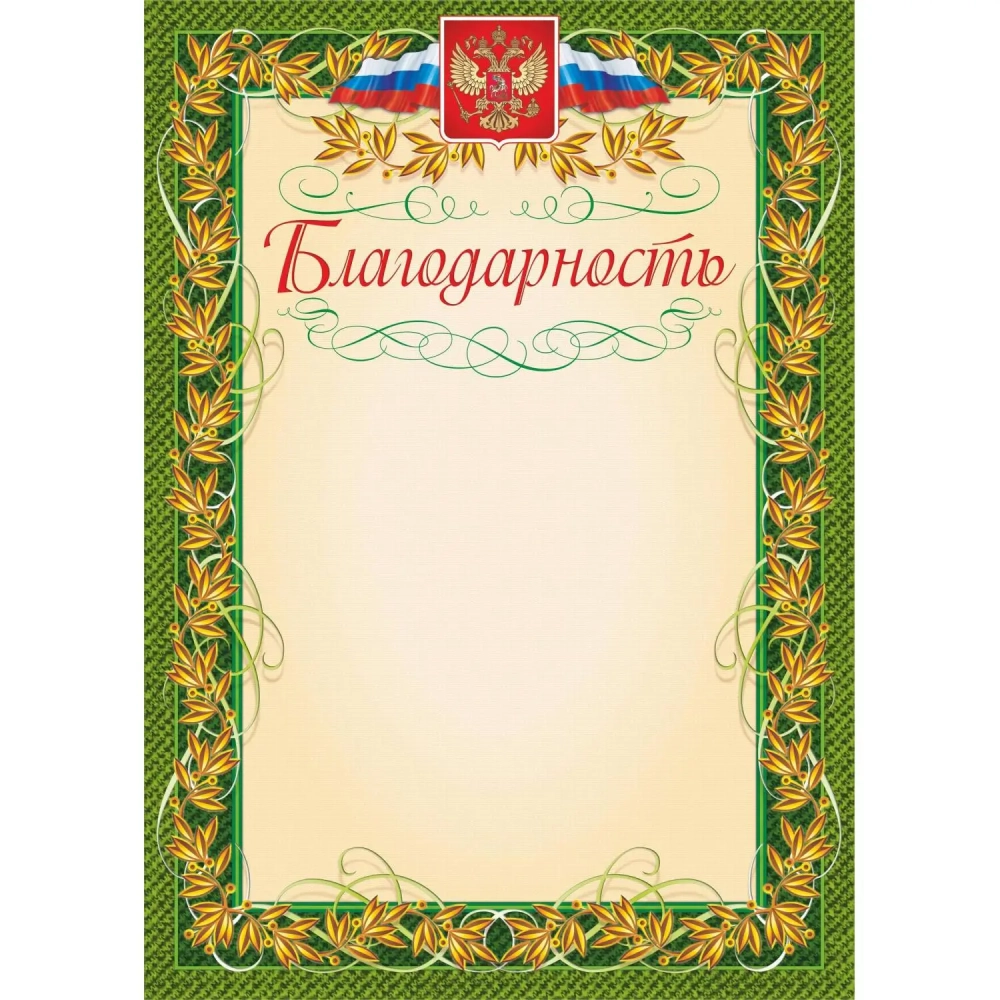 Благодарность (с гербом и флагом, рамка лавровый лист) (уп. 40 шт) КЖ-158уп