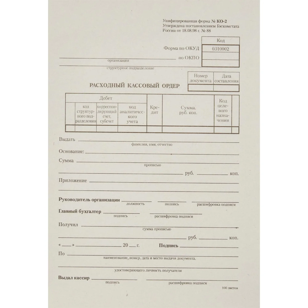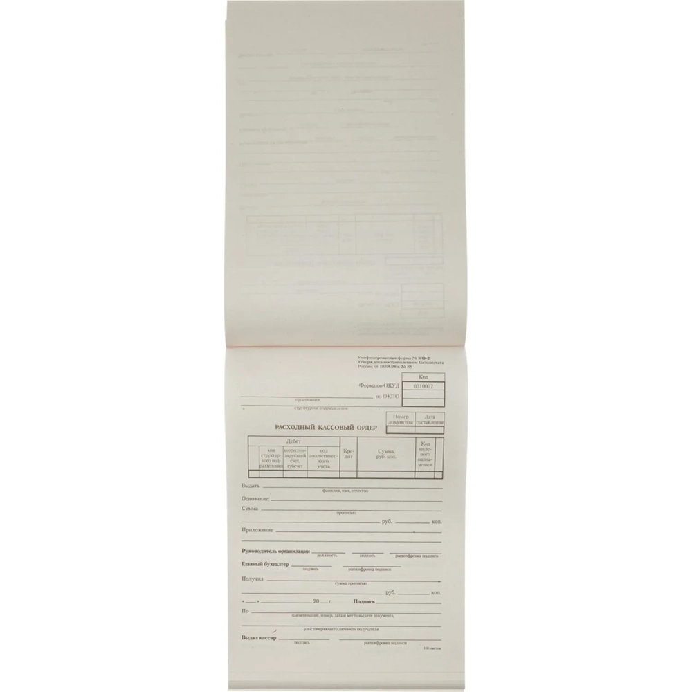 Бланк Расходный кассовый ордер (кн.100л) газетн.бум.20 кн/уп