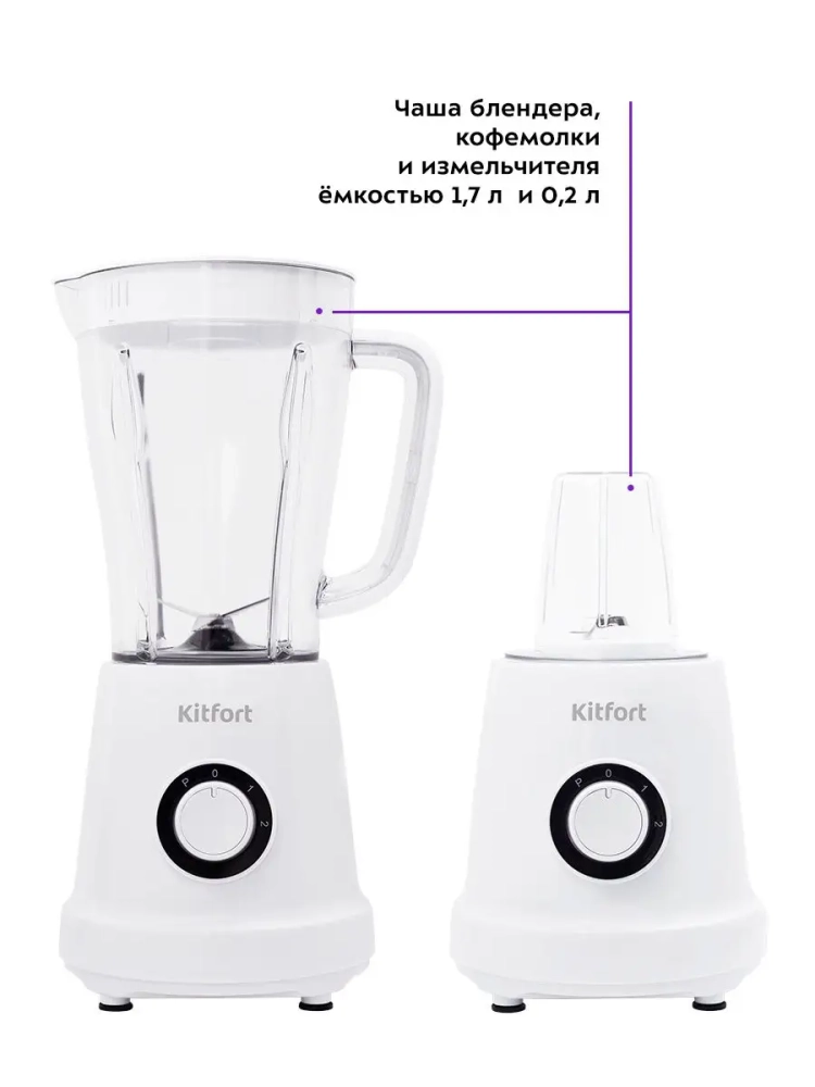 Блендер 3 в 1 KitfortКТ-3019 выполняет функции не только блендера, но также измельчителя и кофемолки.Измельчитель позволит быстро измельчить мягкие продукты, такие как мясо, твердый сыр, овощи, травы, ягоды и многое другое.Кофемолка с легкостью справится с кофейными зернами, специями и орехами. Чаша кофемолки выполнена из прозрачного пластика, что очень удобно для контроля над процессом измельчения.Блендер оснащен вместительной пластиковой чашей с мерной шкалой емкостью 1,5 л. В крышке чаши есть специальное отверстие, закрываемое мерным колпачком, для добавления ингредиентов непосредственно во время работы. Колпачок может использоваться как мерный стакан.Управление блендером осуществляется при помощи регулятора скорости. Переключение скоростей позволяет выбрать оптимальный способ смешивания различных ингредиентов.Ножи блендера выполнены из нержавеющей стали, что обеспечивает их долгий срок службы.