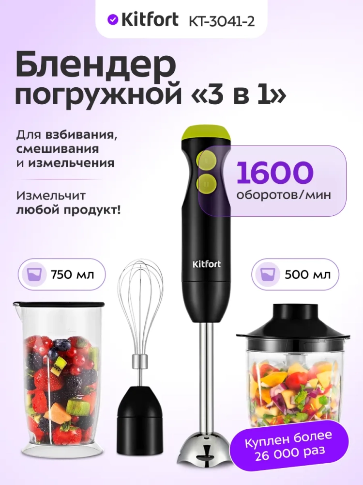 Этот портативный и электрический блендер станет отличным дополнением к вашей бытовой технике. Он подходит как для домашнего использования, так и для профессиональной кухни. Благодаря своей многофункциональности и мощности, блендер КТ-3041 от Kitfort удовлетворит потребности даже самых требовательных пользователей.