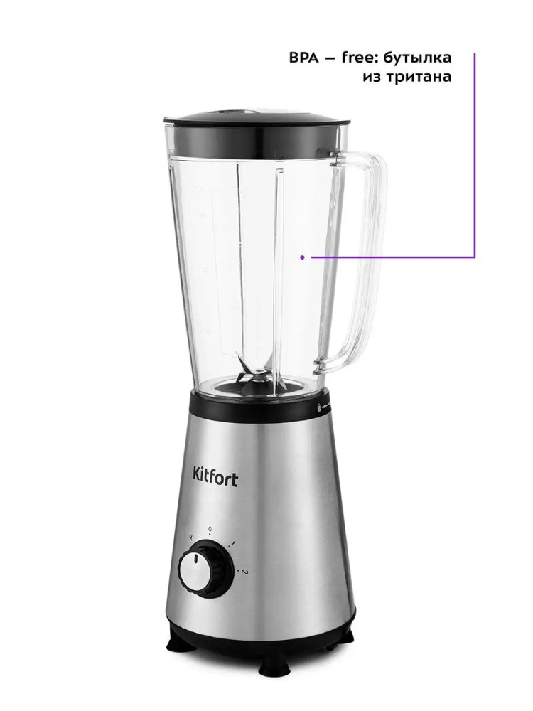 Блендер Kitfort КТ-1340 предлагает две скорости работы и импульсный режим, который подходит для колки льда. Управление осуществляется с помощью удобной ручки выбора режима. Для безопасности прибор работает только с установленной чашей или бутылкой, а резиновые ножки обеспечивают устойчивость на столе.