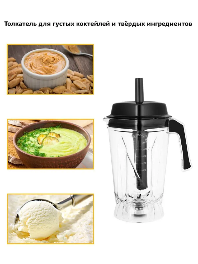 В комплекте к блендеру идет толкатель, который может понадобиться при измельчении твердых ингредиентов.