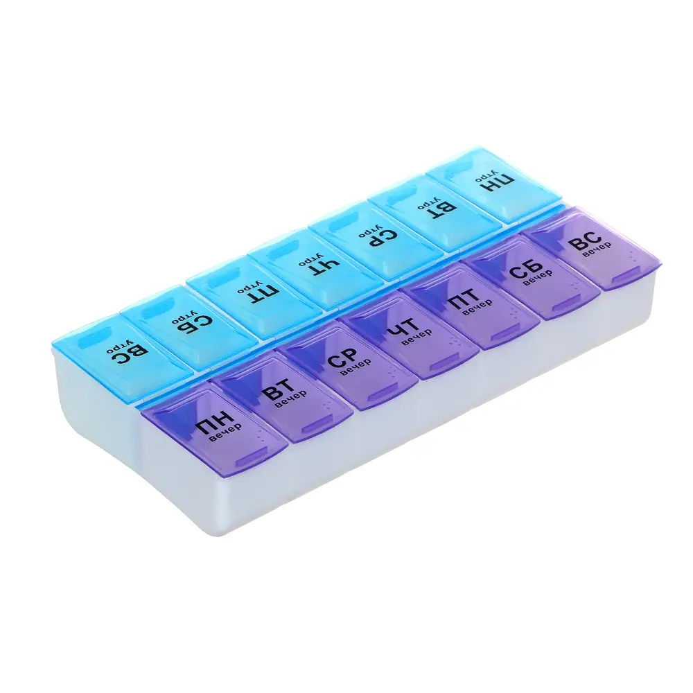Врач выписал препараты для ежедневного приема строго в определенное время суток? Чтобы не держать лишнюю информацию в голове и не пропустить прием лекарств, витаминов или БАДов, был создан Бокс для таблеток VETTA. Пластиковый бокс имеет 14 отсеков с маркировкой по дням недели и времени суток – утро и вечер. В каждый отсек поместится несколько таблеток или капсул. Заготовьте препараты заранее и вам не придется вспоминать, приняли ли вы лекарство в нужное время.