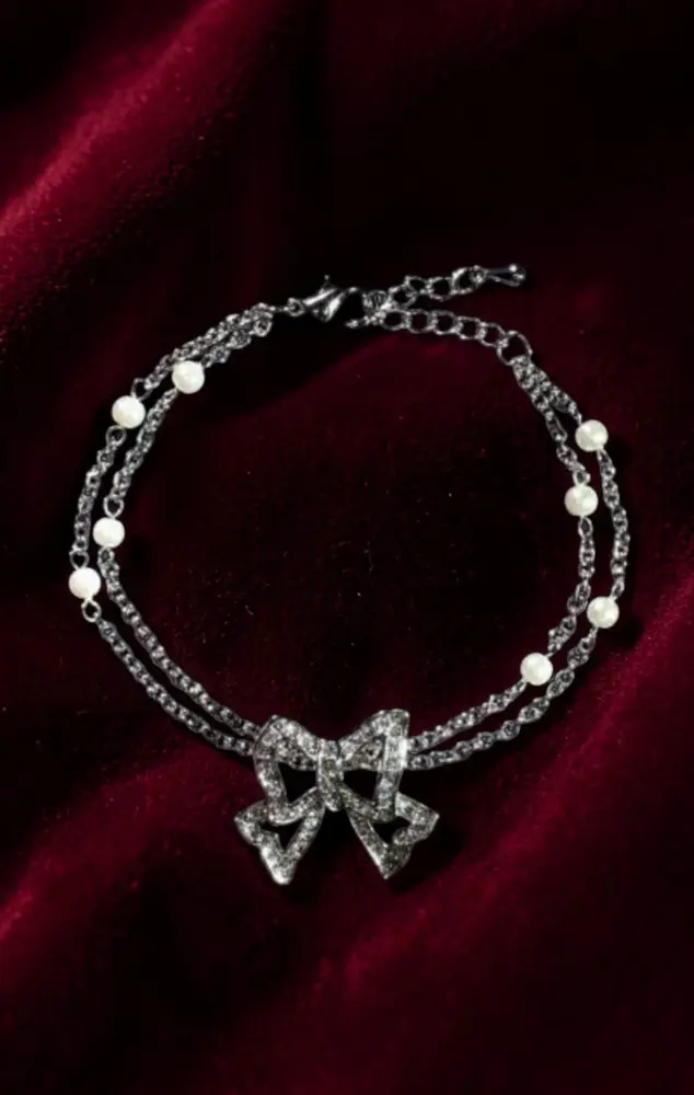 Добавьте нотку аристократизма в ваш образ! Этот двухслойный браслет — идеальное сочетание нежности и характера. Центральный элемент в форме объемного банта, инкрустированного сверкающими кристаллами, притягивает взгляды, а вкрапления белоснежного xhemchuga добавляют композиции классической элегантности. Тонкие цепочки плетения «теннис» мягко ложатся на запястье, подчеркивая его хрупкость. Идеальный выбор для коктейльного платья или строгого вечернего костюма