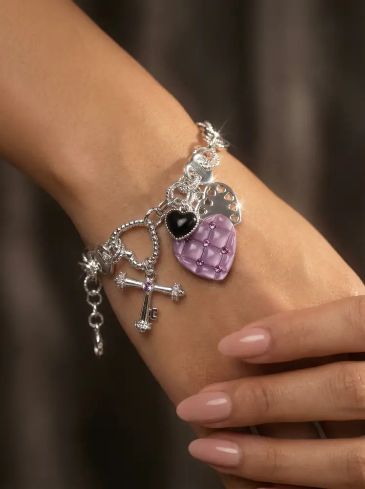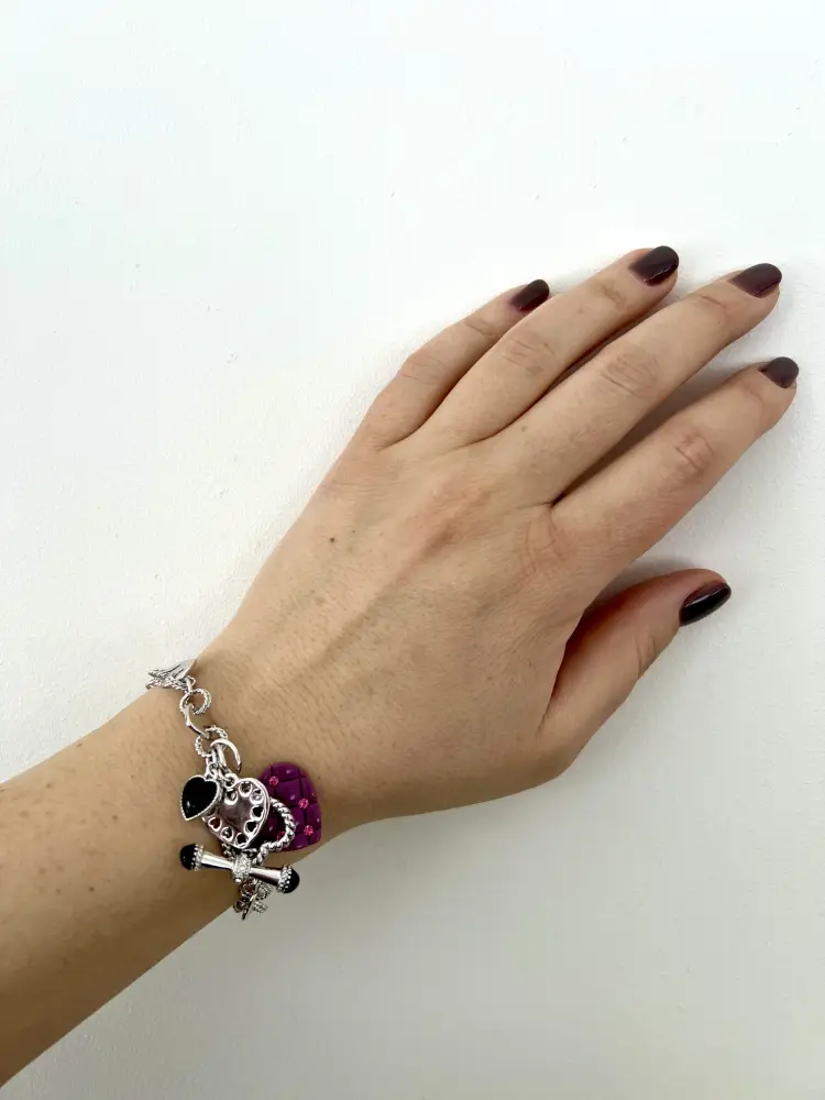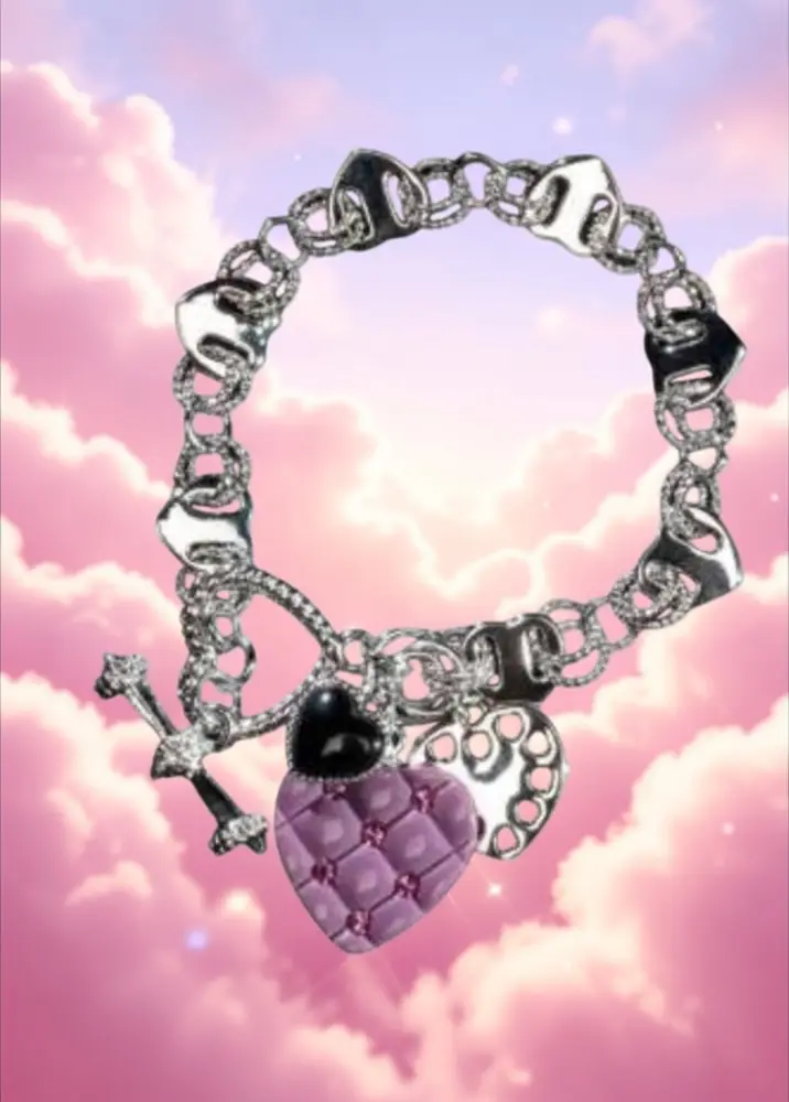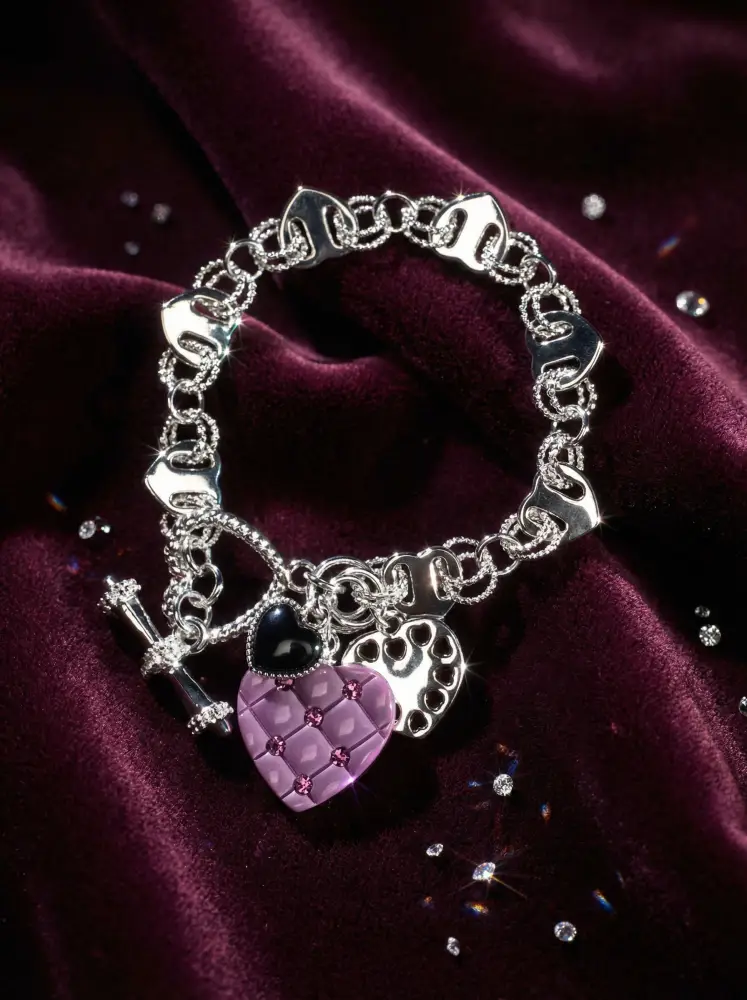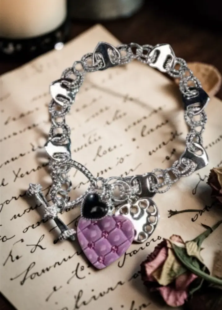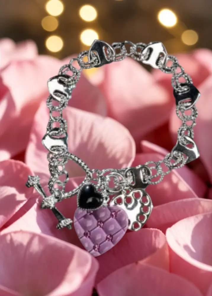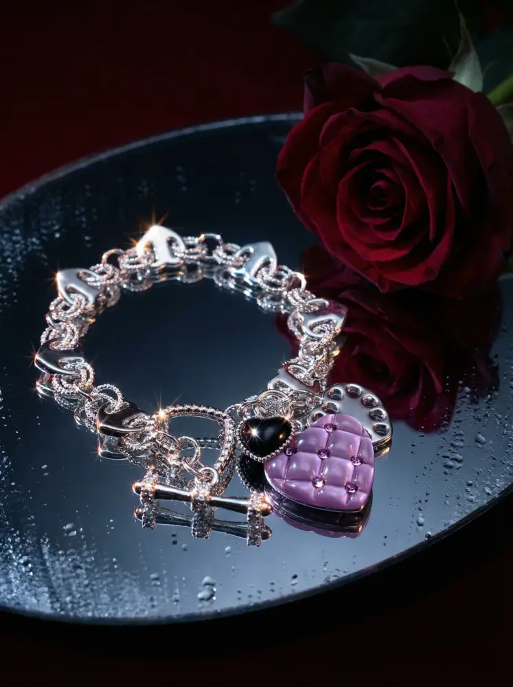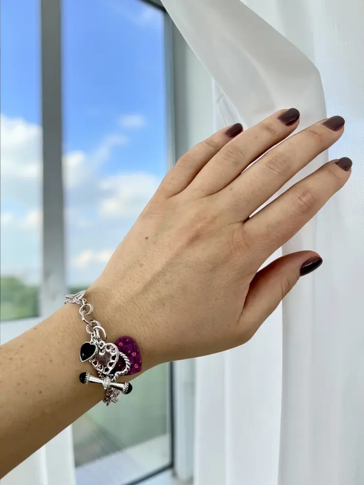 Вспомните то самое чувство первой влюбленности — трепетное, яркое и незабываемое. Этот браслет воплощает в себе нежность и искренность первых признаний. Центральный элемент в виде мягкого розового сердца с «каретной» стяжкой напоминает о первых подарках и тайных записках. Сочетание холодного блеска серебристой цепи и глубокого черного акцента создает стильный контраст, подчеркивая индивидуальность его обладательницы. Это украшение станет вашим персональным символом теплых воспоминаний и веры в настоящие чувства