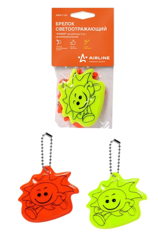 Набор из двух брелоков оранжевого и зеленого цвета с двусторонним рисунком и световозращающим покрытием. Предназначены для крепления на различных предметах и одежде для улучшения видимости на дальнем расстоянии в темное время суток.