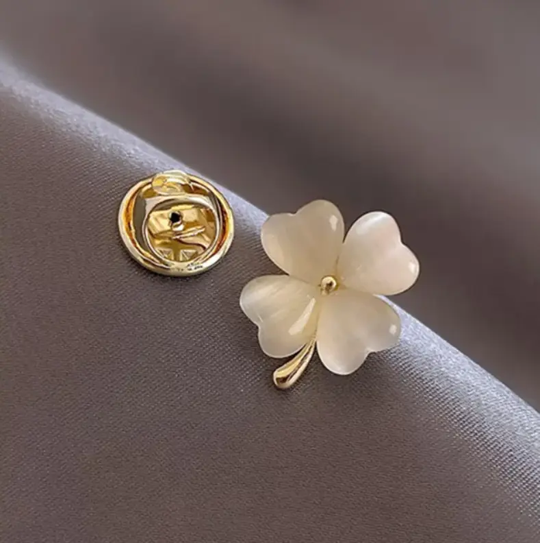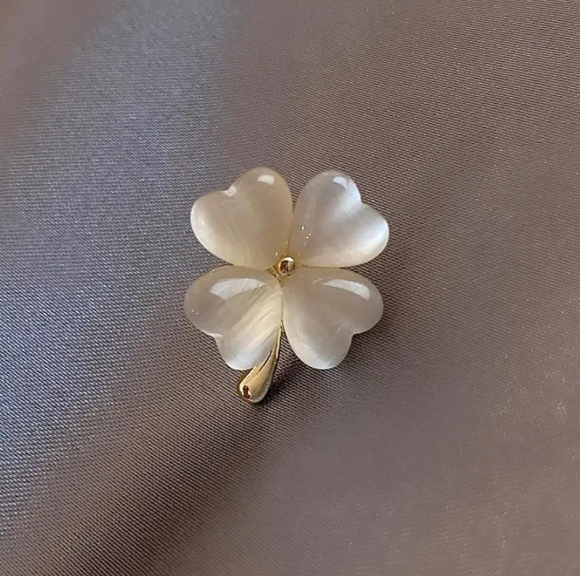Брошь Клевер с камнем кошачий глаз белый золотистая