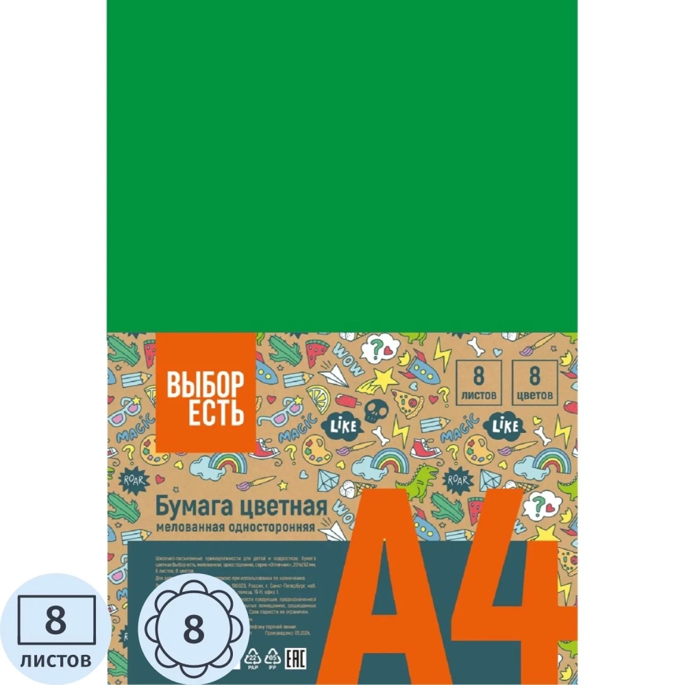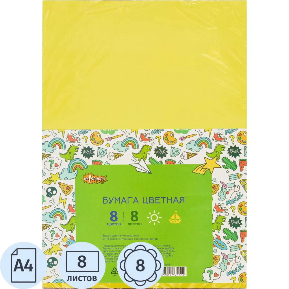Бумага цветная 8л.8цв.А4 мелован Отличник