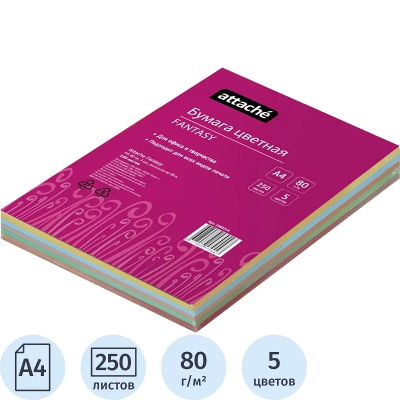 Бумага цветная Attache 'Fantasy' (А4,80г,5цв. интенсив по 50л.) пачка 250л