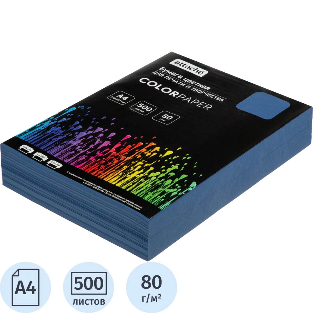 Бумага цветная Attache (синий интенсив), 80г, А4, 500 л