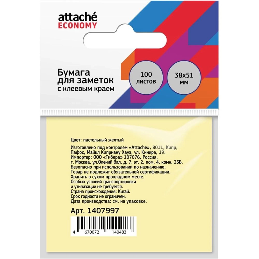 Бумага для заметок с клеевым краем 38x51 мм, 100 л, пастел. желтый