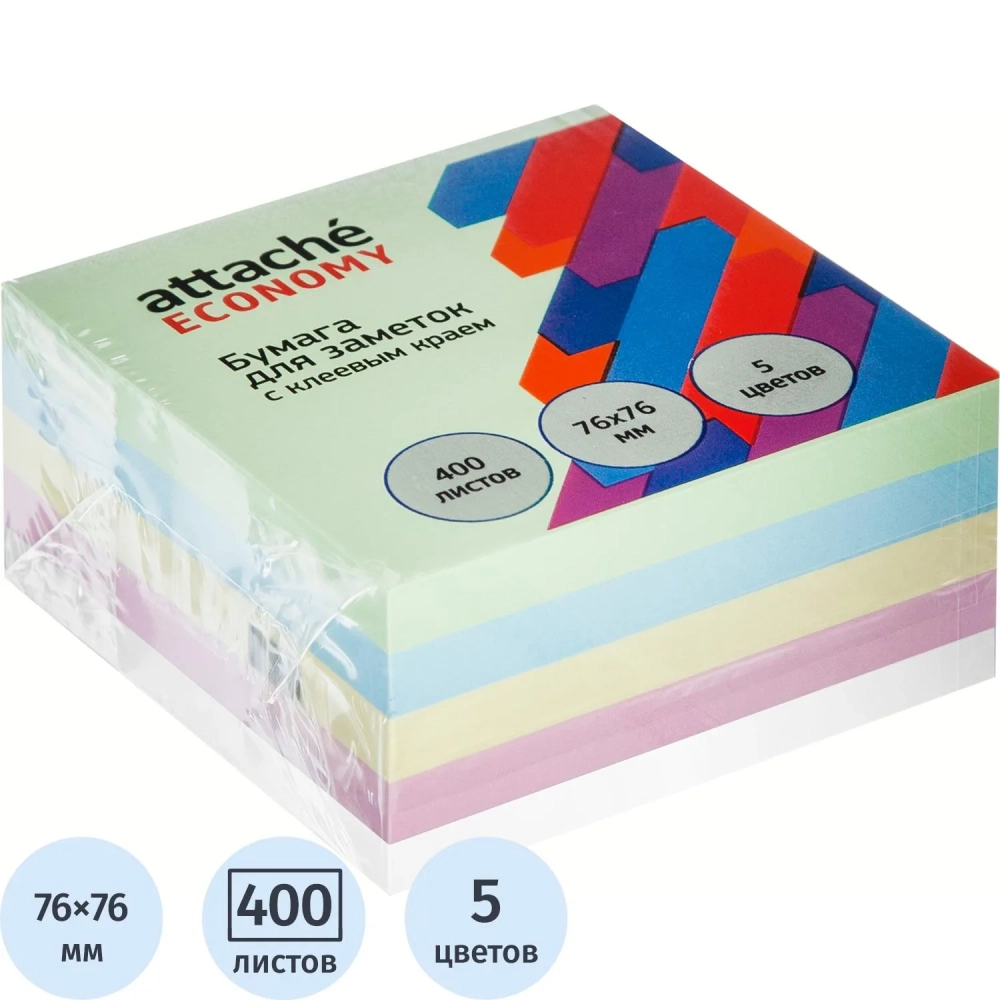 Бумага для заметок с клеевым краем Economy 76х76 мм, 400 л, 5 цветов в асс