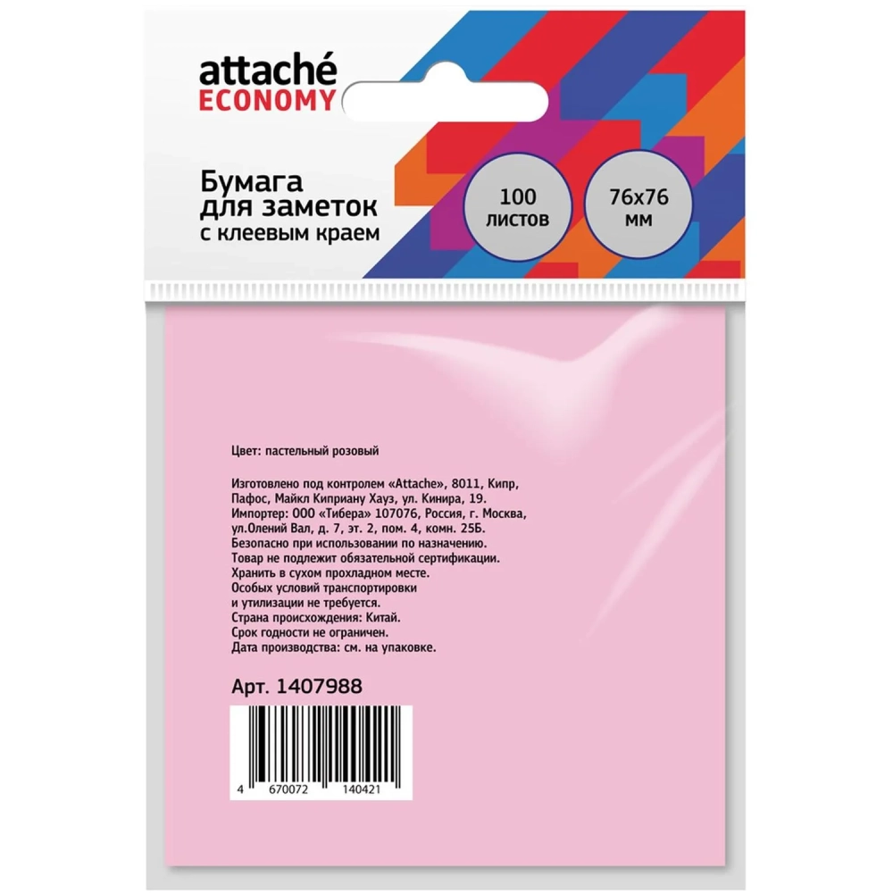 Бумага для заметок с клеевым краем Economy 76x76 мм 100 л пастел. розовый