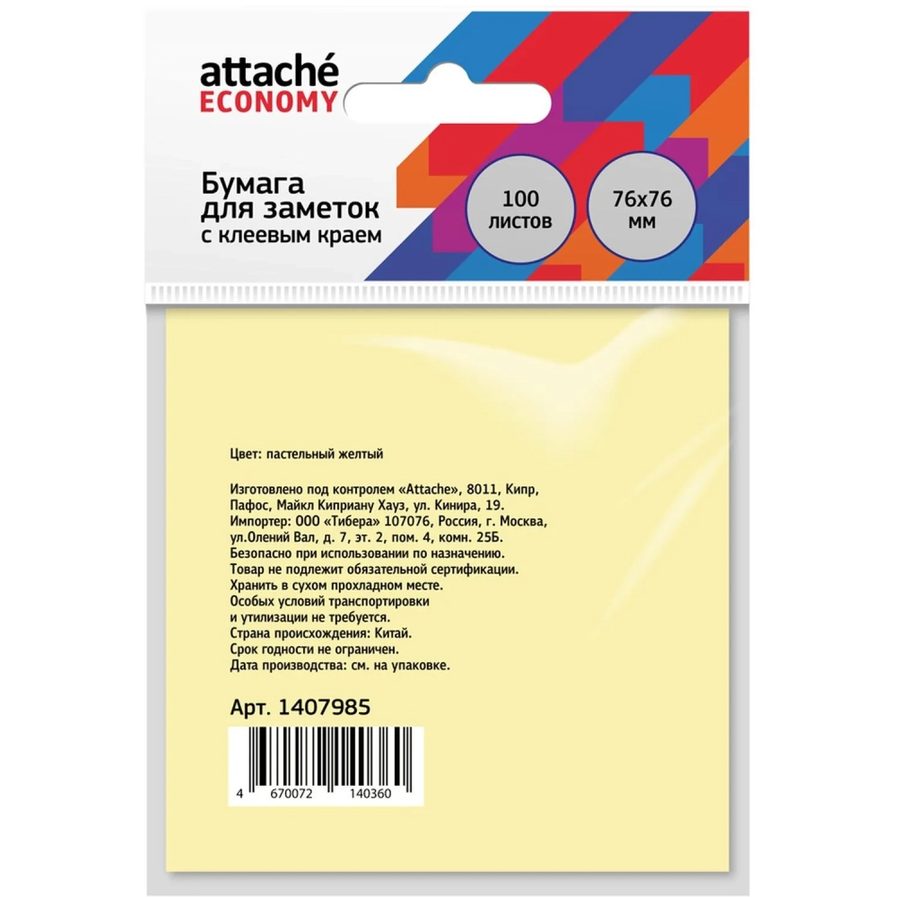 Бумага для заметок с клеевым краем Economy 76x76 мм 100 л пастельный желтый