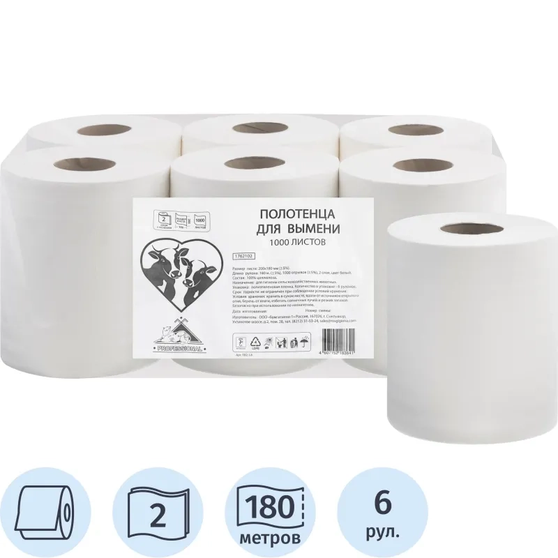 Бумага протирочная для вымени белая 20х18см 1000л 6рул/уп