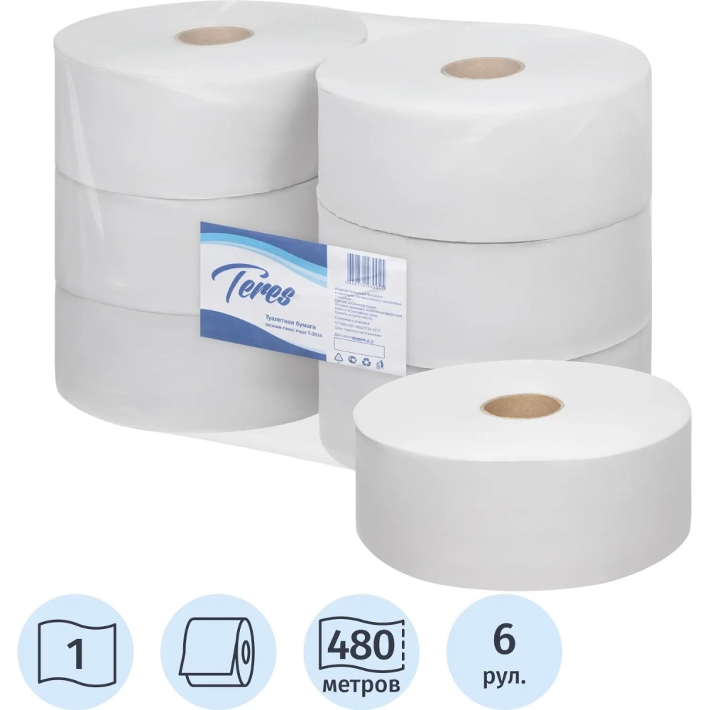 Бумага туалетная д/дисп Терес Эконом макси 1сл бел втор 480м 6рул/уп_T-0014