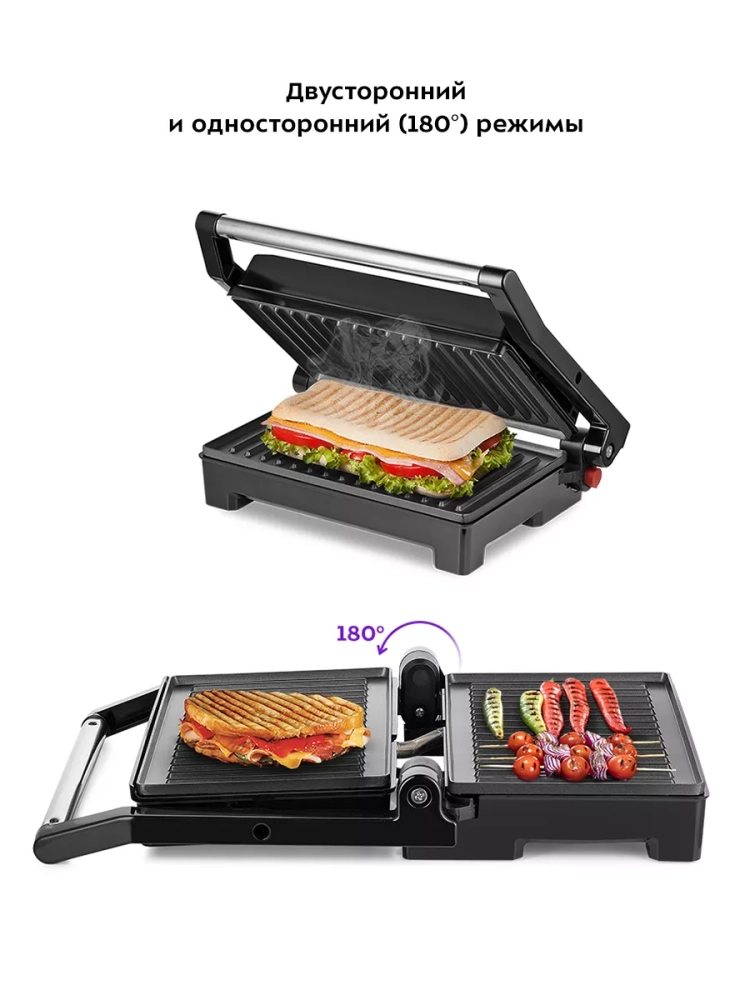 Конструкция бутербродницы позволяет готовить в двух режимах: двустороннем и одностороннем. В двустороннем режиме бутербродница закрывается крышкой, так что продукты находятся между двух нагреваемых панелей и готовятся с двух сторон сразу. Такой способ позволяет сократить время готовки, а также не требует переворачивания продуктов во время приготовления. В одностороннем режиме крышка бутербродницы откидывается на 180°, благодаря чему продукты можно выложить сразу на две панели. Данная модель не оснащена сливом для жира и сока, поэтому необходимо следить за тем, чтобы сок не вытекал через бортики панелей.
