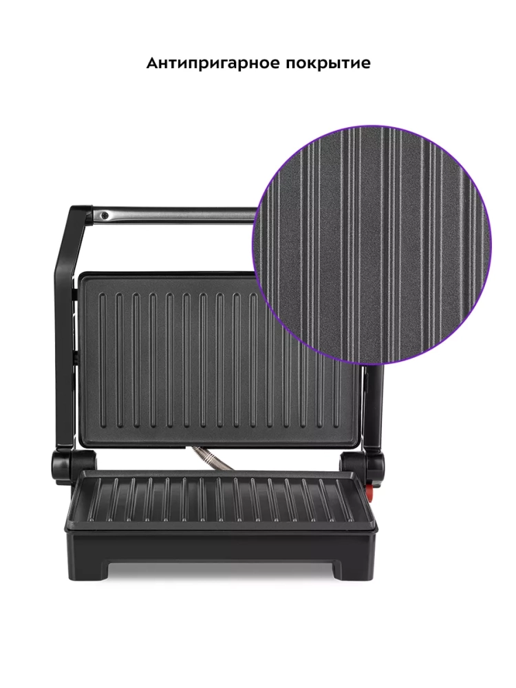 Бутербродница оснащена термостатом для поддержания температуры панелей, а также индикатором нагрева. Противоскользящие ножки не дают прибору скользить по столу во время готовки.