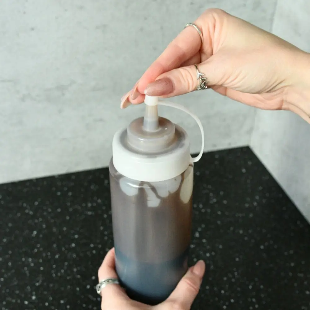 Удобная емкость для хранения соусов, теста, сиропов и других жидких продуктов в холодильнике. Бутыль имеет клапан, препятствующий попаданию воздуха и порчи содержимого. Тонкий носик позволяет использовать бутыль для жидкого теста при приготовлении ажурных блинчиков и оладий. Носик также позволяет декорировать выпечку кремом или глазурью. После использования промойте его в теплой воде, можно с жидкими моющими средствами и просушите. Изготовлено из пластмассы (полиэтилен, полипропилен).