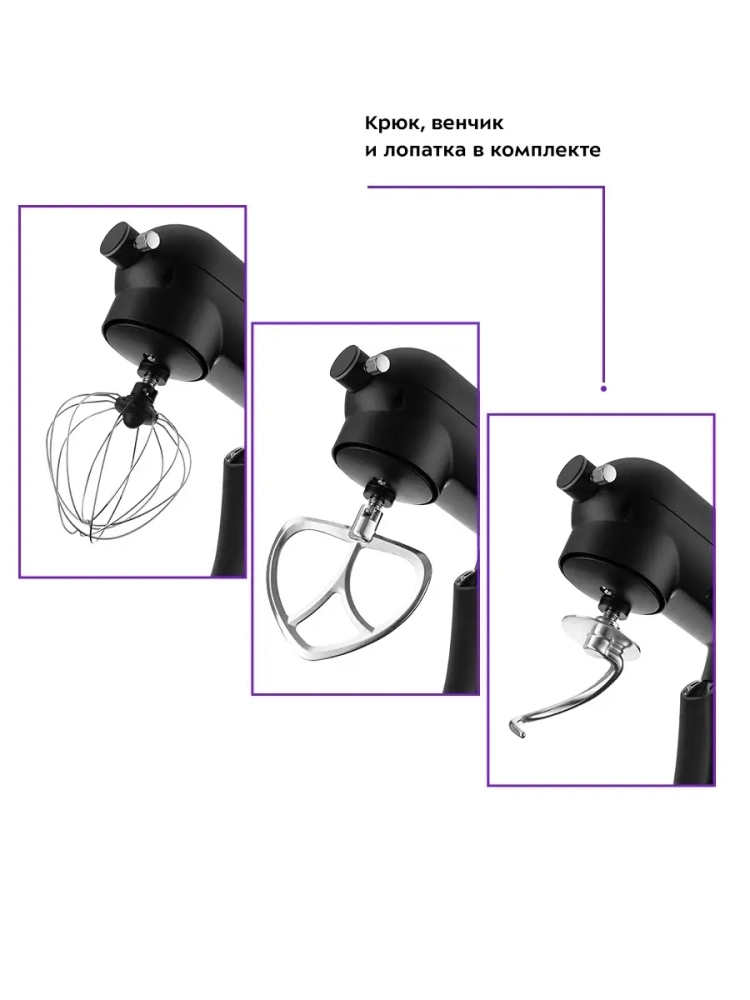 Миксер комплектуется различными насадками, что делает его универсальным инструментом на кухне. Вы сможете легко приготовить не только тесто, но и другие блюда, используя его как комбайн. Мощный двигатель и прочная конструкция гарантируют долгий срок службы, а стильный дизайн впишется в любой интерьер кухни.