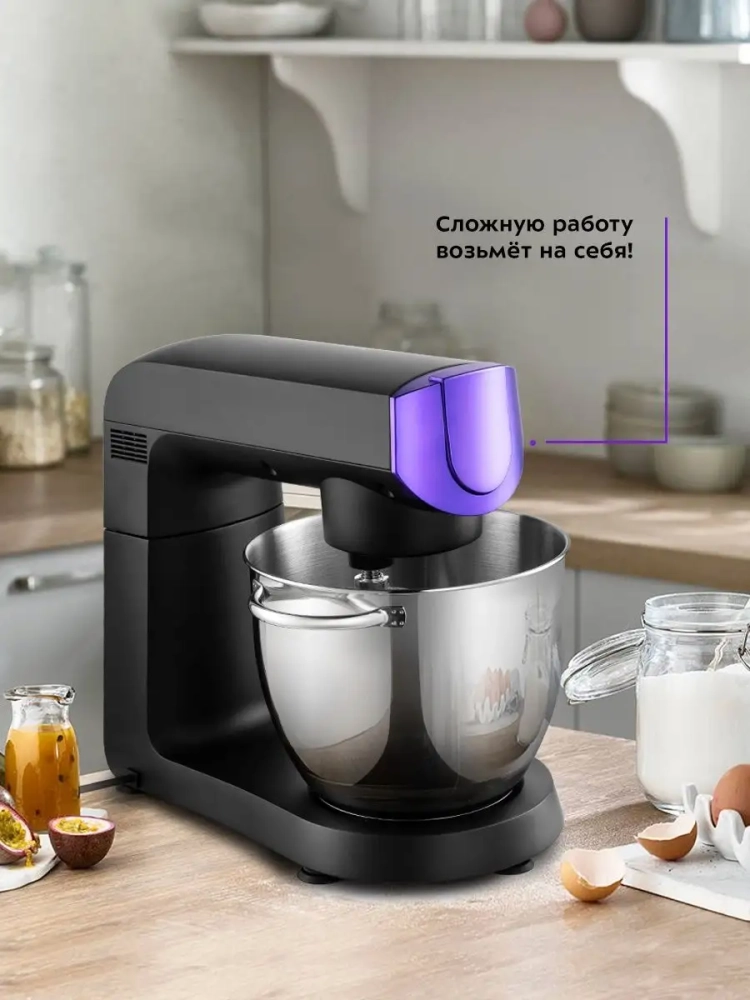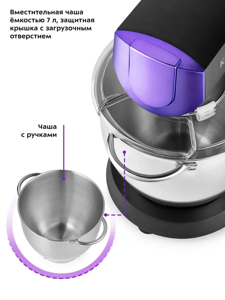 Кухонный комбайн с чашей из нержавеющей стали устойчив к износу и легко моется. В комплект входят различные насадки, которые расширяют функциональность устройства, превращая его в универсальный кухонный инструмент. С помощью этого миксера вы сможете готовить не только тесто для пиццы, но и разнообразные блюда, используя его как стационарный блендер.