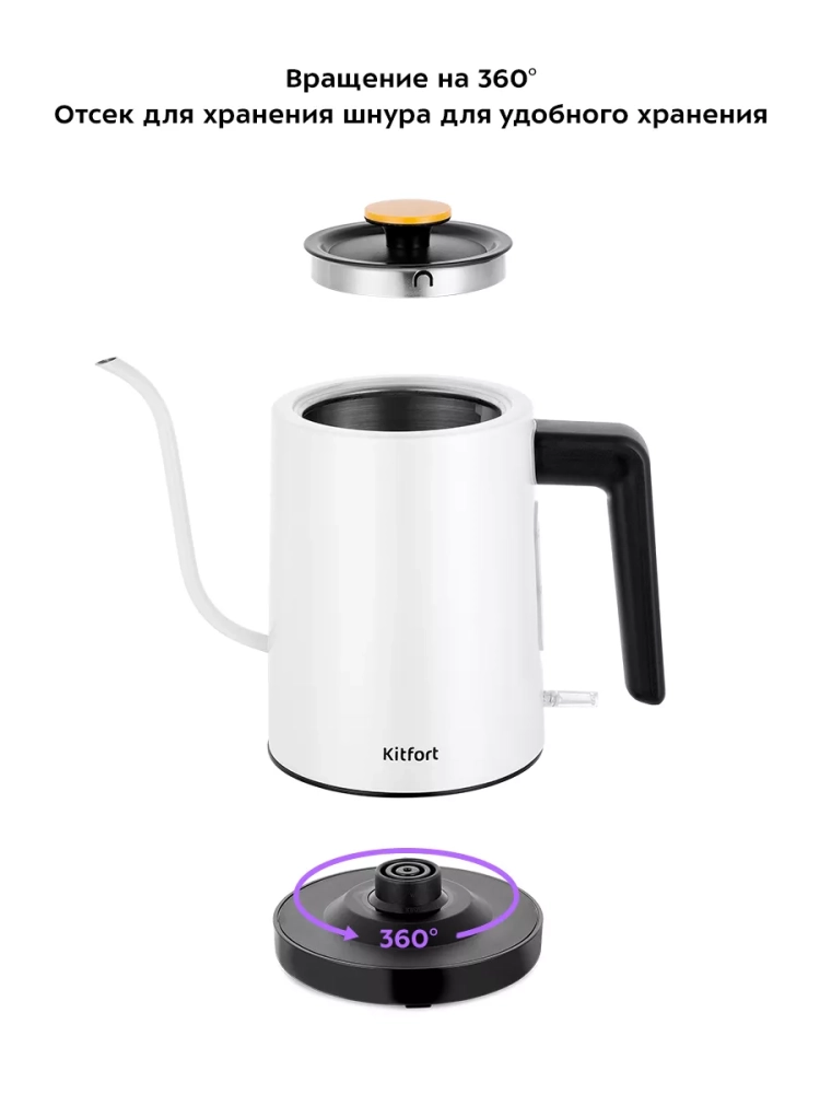 Подставка с центральным контактом дает возможность располагать на ней чайник в любом положении, обеспечивая вращение на 360°. Снизу имеется отсек для хранения шнура.