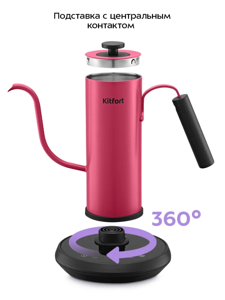 Чайник для варки кофе Kitfort КТ-6759 предназначен для кипячения и нагрева воды, а также для приготовления кофе способами кемекс и пуровер. Прибор может нагреть воду до температуры от 60 до 100 °С и поддерживать ее в течение 1 часа. Температура воды контролируется встроенным в дно чайника термодатчиком.