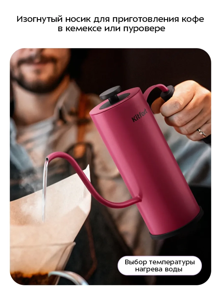 Длинный изогнутый носик чайника формирует тонкий и ровный поток воды, что является обязательным условием для приготовления кофе в кемексе или пуровере. Благодаря тонкому носику вы сможете постепенно и аккуратно добавлять воду в кофе, добиваясь равномерной экстракции. Контролировать пролив воды с помощью обычного чайника неудобно, так как широкий носик не позволяет добиться точно направленной струи воды с определенной скоростью, и в результате вкус и аромат кофе раскрываются не полностью.