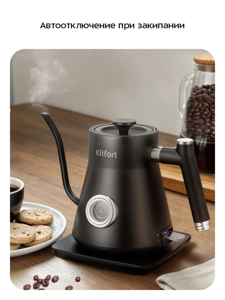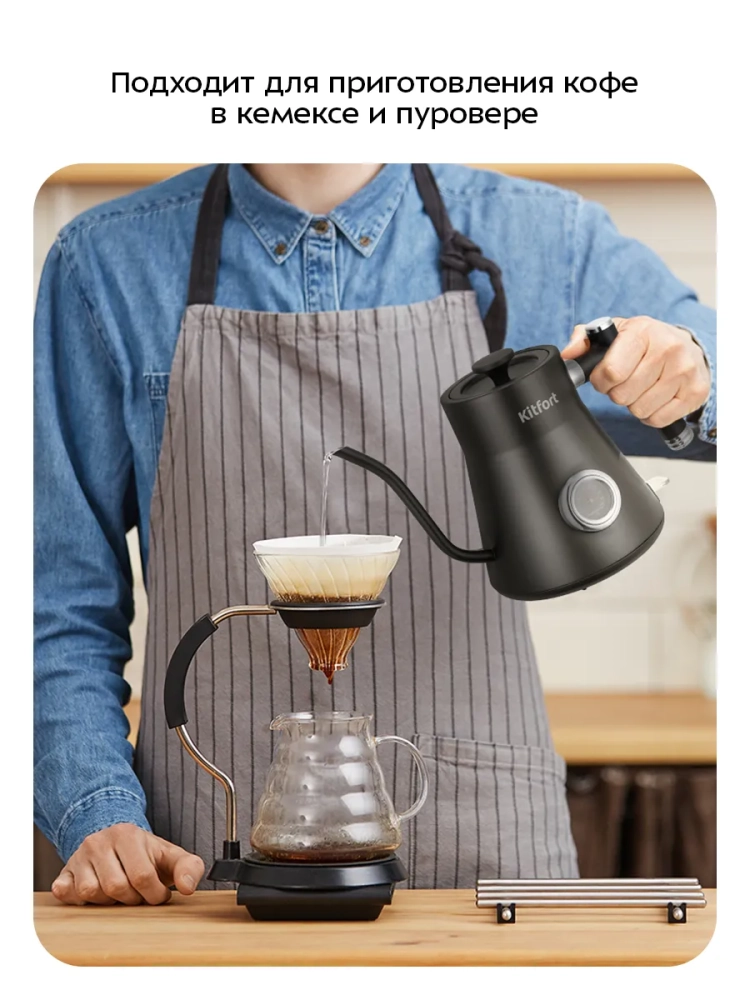 Электрический чайник Kitfort KT-6760 предназначен для кипячения воды и приготовления кофе способами кемекс и пуровер.