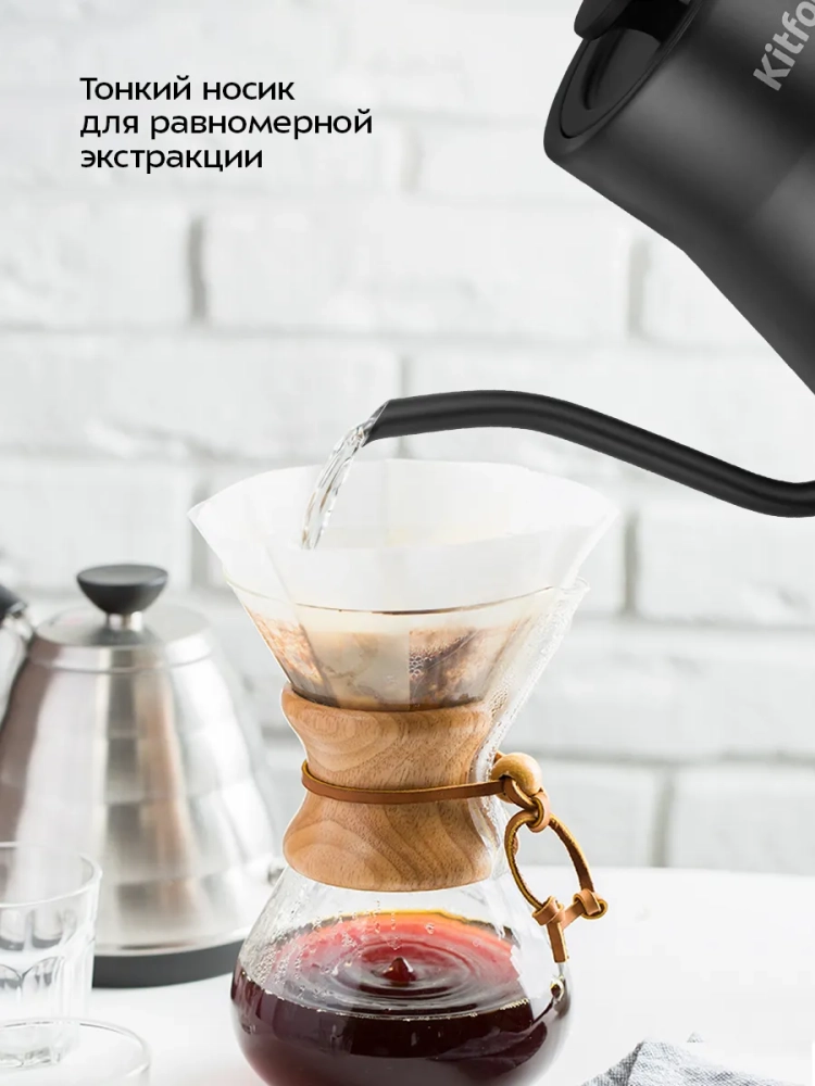Длинный изогнутый носик чайника формирует тонкий и ровный поток воды, что является обязательным условием для приготовления кофе в кемексе или пуровере. Благодаря тонкому носику вы сможете постепенно и аккуратно добавлять воду в кофе, добиваясь равномерной экстракции.
